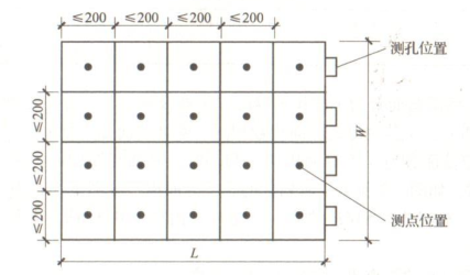 對(duì)于矩形風(fēng)管,將測(cè)定截面分成若干個(gè)相等的小截面,并盡可能接近正方形,邊長(zhǎng)最好不大于200mm,其截面積不大于0.05m2,測(cè)點(diǎn)置于各個(gè)小截面的中心處,整個(gè)截面測(cè)點(diǎn)數(shù)不宜小于4個(gè),測(cè)點(diǎn)布置如如下圖1所示。