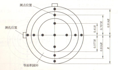 當(dāng)圓風(fēng)管測(cè)定截面分為3個(gè)等面積圓及圓環(huán)時(shí),其測(cè)點(diǎn)距中心的距離距離分別為0.41R,0.707R和0.914R,如上圖2所示。所劃分的3個(gè)等面積,分別是半徑為0.577R的圓面積及內(nèi)徑為0.577R、外徑為0.816R的第一個(gè)圓環(huán)及內(nèi)徑為0.816R、外徑為R的第二個(gè)圓環(huán)。