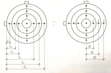 各測(cè)點(diǎn)距測(cè)孔距離L1、L2(見(jiàn)下圖)按下式計(jì)算: