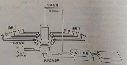 另一種順序監(jiān)測(cè)系統(tǒng)則僅在潔凈室各關(guān)鍵部位設(shè)置空氣采樣口,通過(guò)氣溶膠導(dǎo)管將所設(shè)置的多個(gè)采樣口與配置有激光粒子計(jì)數(shù)器及計(jì)算機(jī)的順序監(jiān)測(cè)系統(tǒng)相連。由計(jì)算機(jī)控制激光粒子計(jì)數(shù)器順序與各采樣口的氣溶膠導(dǎo)管相通,由氣泵采入與之相通的空氣采樣口處的空氣,進(jìn)行粒徑與數(shù)量的測(cè)量,并將結(jié)果錄入計(jì)算機(jī)中,其工作原理如下圖: