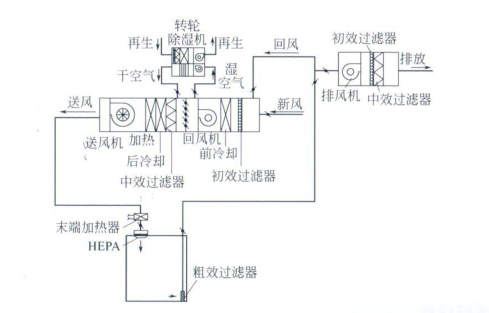 有些藥品需要有較低的相對(duì)濕度,而傳統(tǒng)的冷凍去濕法只能使相對(duì)濕度達(dá)到50%左右,要想獲得更低的相對(duì)濕度必須采用化學(xué)處理的方法,常用的就是采用氯化鋰轉(zhuǎn)輪除濕機(jī)。注意不能把各種類型的除濕機(jī)直接放在潔凈室內(nèi)。下圖所示的是帶除濕機(jī)的空氣凈化系統(tǒng)。
