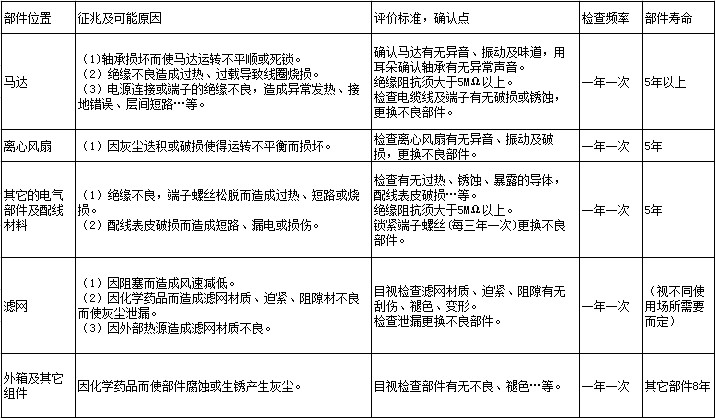 FFU高效過(guò)濾單元使用一段時(shí)間后,因使用的環(huán)境和使用狀況的差異,為了防止意外,請(qǐng)定期按照下表進(jìn)行定期檢查,當(dāng)部件壽命損耗完,請(qǐng)馬上更換部件。