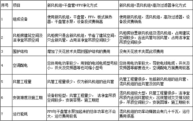 部分企業(yè)認(rèn)為新風(fēng)機(jī)組+干盤管+FFU凈化方式比常規(guī)凈化空調(diào)方式的初投資要高,現(xiàn)比較如下: