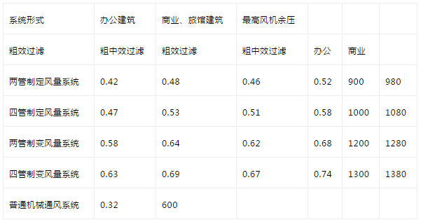 送風(fēng)系統(tǒng)單位風(fēng)量的功耗Ws應(yīng)不大于下表限值: