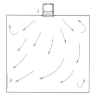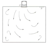 凈化空調(diào)設(shè)計(jì)中,氣流組織設(shè)計(jì)是很重要的項(xiàng)內(nèi)容, 它關(guān)系到潔凈室的成敗。而氣流組織設(shè)計(jì)是通過(guò)合理布置送風(fēng)口、回風(fēng)口、排風(fēng)口實(shí)現(xiàn)的,如果送風(fēng)量、回風(fēng)量、排風(fēng)量計(jì)算正確但風(fēng)口布置不合理,也達(dá)不到所需的效果,甚至導(dǎo)致設(shè)計(jì)失敗。比如有一間潔凈室,要求達(dá)到1萬(wàn)級(jí)潔凈度,經(jīng)計(jì)算送風(fēng)量為900m3/h,回風(fēng)量為850m3/h。如下圖a所示,布置額定風(fēng)量為1000 m3/h的送風(fēng)口A一臺(tái),回風(fēng)口B一個(gè)且設(shè)置在短邊上,這種氣流組織設(shè)計(jì)肯定達(dá)不到所要求的潔凈度(盡管風(fēng)量計(jì)算正確)。可以想象一下,這種送、回風(fēng)口的布置,氣流在室內(nèi)是怎樣流動(dòng)的,主流區(qū)、渦流區(qū)、回風(fēng)區(qū)各在什么位置,如圖b所示。